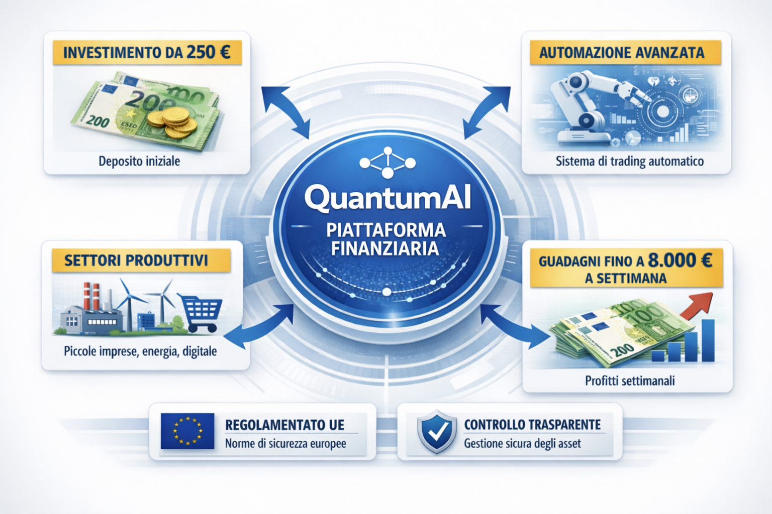 QuantumAI è una piattaforma finanziaria di nuova generazione, creata con il contributo di gruppi imprenditoriali italiani. Permette a chiunque di iniziare a investire a partire da 250 euro, utilizzando un sistema automatico precedentemente accessibile solo ai grandi capitali, con il potenziale di generare fino a 8.000 euro a settimana.